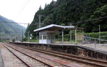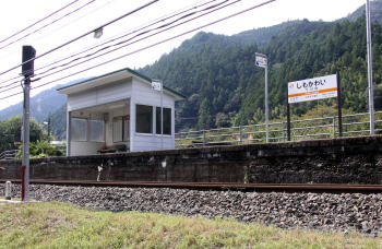 13:22 下川合駅着、待合室の載った片面ホーム、59.9KPあり、ホーム左手は県道と大千瀬川の流れ、右手は狭い畑が30M程あってその先は山、駅前の小道に面し結構大きなプレハブ宿舎が2棟、これは後で分ったが、大千瀬川左岸の山肌を削ってバイパス道路(?)が大規模建設中で、その建設作業員用だった。