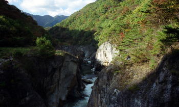 さて次駅まで営業キロで3.1K、内2.6Kは小網隧道が占める、自分は龍王峡沿いの遊歩道コースを取る、展望台付近は混雑、前の人を追抜くのもままならない。道は岩の多い坂道、ハイヒールのドライブ客など難儀している。